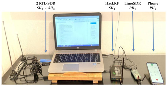 Basically, for each considered SDR device, three parameters are set: the sampling rate , the center frequency (of reception), and the gain. For the devices used in the proposed scenario, we have a sampling rate of 20 MHz for the HackRF One, 3.2 MHz for the RTL-SDR, and 30.72 MHz for the LimeSDR. The initial gain of each device is 0 dB, which means that the power of the signal perceived by each device is not increased. Nevertheless, this parameter can be modified if the PU transmission power is imperceptible by the SDR device (this value is chosen by the user).