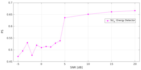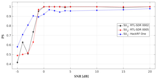 Furthermore, the implementation of an energy detector (ED) [44] was carried out with an RTL-SDR (denoted ) at MHz with a bandwidth of 2.4 MHz, which means that was perceived in the same radiofrequency space as . For this technique, the threshold of was placed at −80 dBm, which is the same value that was chosen for the cluster selection stage in the algorithm to classify the approximation coefficients in [12] through the K-means technique. Figure 21 shows the result of applying this conventional ED. In this case, the average estimated PS was 0.64 for values of SNR 5 dB. This poor result is not surprising, due to the nature of the proposed methodology. Indeed, even if the considered band is a single one, the PS is calculated as an average of detected occupation windows inside the band (i.e., an MBSS is created for each considered SDR, thereby randomly varying the transmission location) to further decide if each detected window is free or not, via the HFD. In the case of the ED, many more windows are detected in error, inducing a lower PS estimate. This is due to the misclassification of the PSD signal by the ED in a short frequency range. This phenomenon greatly reduces the PS even though it correctly locates the PU transmission.