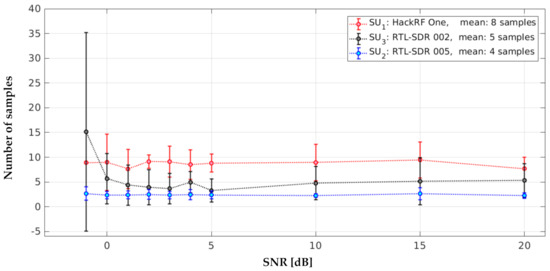 We also estimated the samples in error, defined as the samples that detected the start or end edge of a PU transmission. Figure 22 shows that, for values of SNR ≥ 0 dB, the samples in error were stable for each SU; however, the RTL-SDRs presented a better result for detecting PU with greater precision, with between three and five samples on average for samples in error, whereas the HackRF One had between eight and nine samples, which is a good performance. The samples in error presented in [12] were between two and three samples on average.