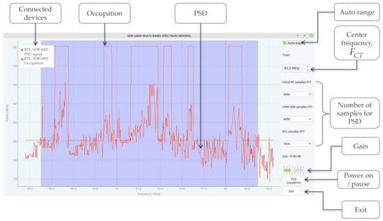 Lastly, the proposed methodology for the implementation of the MBSS technique using low-cost communication devices was consolidated in the development of an application named SDR–UAMI–MBSS. This interface shows the PSD and the occupation of a spectrum interval (see Figure 24), specifically, the radioelectric space that the SUs (connected SDR devices) can visualize as a whole; it consists of advanced digital signal processing techniques and was developed in Python language. This application is easy to use, intuitive, and quite descriptive. This allows the user to have an easy interaction. Furthermore, it is an open-source application; it also allows knowing precisely what each module does, and whether it is possible to improve it. The SDR–UAMI–MBSS interface is a branch of the SDR–UAMI application [29].