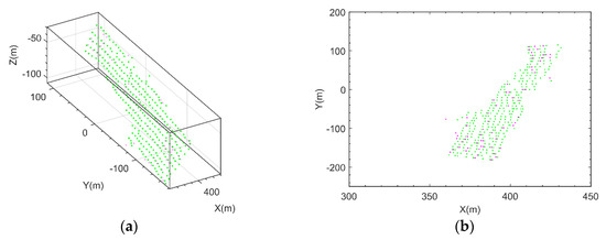 Figure 8 presents slope imaging point analysis in a monitoring area, where the pink dot is the target with the largest amplitude obtained by the amplitude threshold method, the green dots are the candidate targets obtained by the method in this paper, and the dot in the red box is the slope imaging target. Figure 9a presents the three-dimensional imaging results comparison between the proposed method and the point cloud. To further analyze the imaging situation, the two images were projected in the 2D planes XOY, XOZ, and YOZ. The specific results are shown in Figure 9b–d, where O-XYZ was the spatial Cartesian coordinate system corresponding to the radar polar coordinate system.