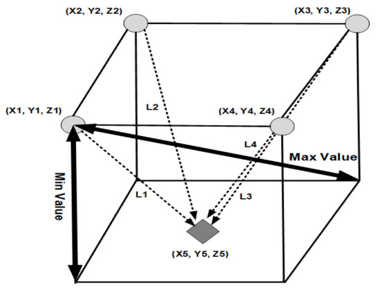 In the proposed technique, we use the Thomas algorithm’s multivariate method as shown in Figure 3 to describe the minimum and maximum values of distances that can occur within the space for measuring AIoT position information, while simultaneously correcting the accuracy.