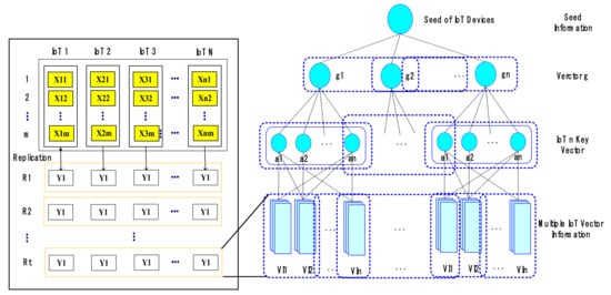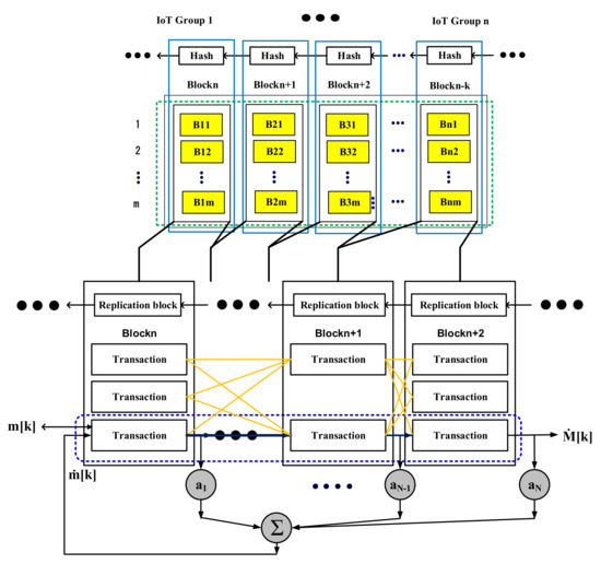 In Figure 2, the information of all IoT devices can be negotiated with the multi-hash function : so that it can be transmitted and received in a distributed cloud environment. The negotiated blockchain of IoT information is reproduced in any block (= ) (i , ) size of -bit, where i stands for security parameters and s stands for seed.
