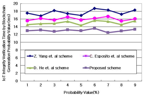 Figure 7 and Table 3 show the results of comparing the verification time of the integrity of IoT information according to the probability value of creating a blockchain. According to Figure 7 and Table 3, the total IoT information according to the number of attribute information (date, time, size, purpose, etc.) of IoT information was grouped into n groups and the IoT information was linked to each other as probability values. Depending on the probability value of creating a blockchain, the verification time of IoT integrity according to the time to create an IoT blockchain improved by an average of 13.7% compared to the time when it did not. This result is because IoT information generated blocks of a certain size through sequential hierarchies and processed the linkage between IoT information. Furthermore, the proposed technique is because IoT information was accurately generated with a certain probability over time.