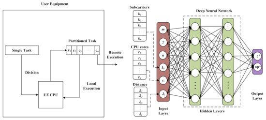 In the proposed work, first we divide a task into n components and then using the partial offloading technique, the UE offloads some of the components to MES and some of the components are executed on UE. However, for a task of size m there are possible partitioning options and possible offloading options, therefore, to find the option with minimum cost, the complexity of the algorithm becomes . To avoid this computation overhead and high complexity, we generate a training dataset using our comprehensive mathematical model to find the cost for all options. In Algorithm 1, we consider all possible partitions (partition matrix, ) and all possible partial offloading policies (offloading policies matrix, ) for a task of size m with a constant . We select the option with minimum cost and store its corresponding input data, partitioning option, and offloading policy as a training dataset for different task sizes. To consider the dynamics of the system, we take the input parameters (frequency of UE, tranmiting power of UE, distance between UE and MES, subcarriers, computing resources of MES, number of components, division resolution, and task size) as uniform random distribution for different datasets. This training dataset is used to train the DNN and reduce the complexity to of the trained DNN. The trained DNN has the ability to address the dynamics of the system because in the training dataset we consider all the dynamics in the input data parameters. Our proposed technique considers the comprehensive cost function to minimize the energy consumption and service delay, therefore, we name the proposed technique as comprehensive and energy efficient deep-learning-based offloading technique (CEDOT). There are three types of layers in the DNN [44,45], namely input layer, hidden layer, and output layer. The input layer consists of the information about the size of task, division resolution , number of components, distance from MES, available computing resources of MES, and network status, as shown in Algorithm 1. The two hidden layers consist of 100 neurons each. The output layer gives the information about the best option for division and offloading decision for each component represented by . The rectified linear unit (ReLU) and Softmax activation functions [46,47] are used for two hidden layers and an output layer, respectively. The trained DNN is tested on unseen data to calculate the accuracy of the proposed technique. We achieve more than 70% accuracy for different sets of test data.