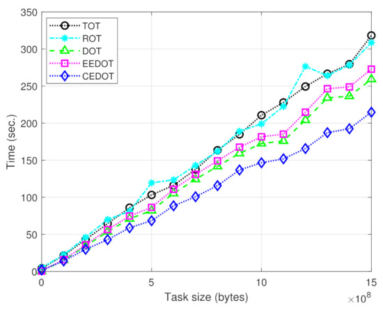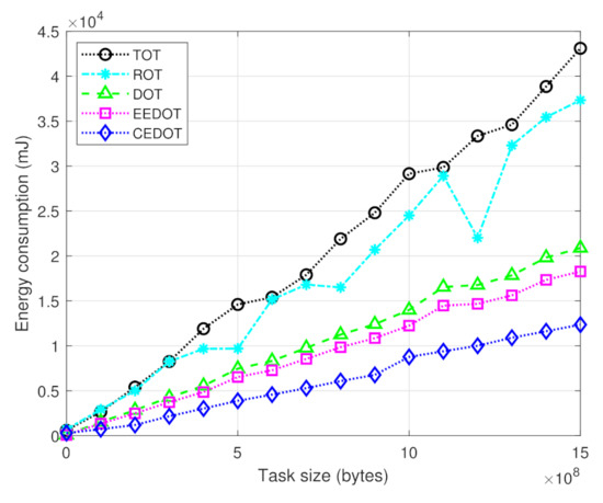 Figure 2 presents the comparison of energy consumption of a UE with a varying task size. The energy consumption of CEDOT is minimum because it considers the suitable component size along with the offloading policy having minimum cost. For different component sizes, the energy consumption varies with different offloading policies. However, the proposed technique selects the offloading policy with minimum cost of portioning and offloading.