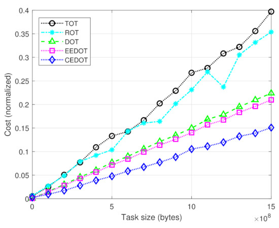 Figure 4 shows the normalized cost of all the techniques with a varying size of tasks. The cost of the proposed technique is minimum because it selects the minimum value among possible values of the cost. However, the other benchmark techniques ignore this fact and select the cost value depending only on time or energy consumption.