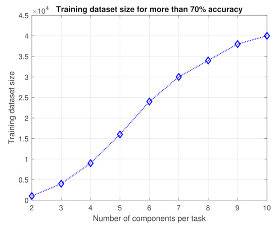 Figure 5 presents the size of training dataset along with a different number of components per task. As the number of components per task increases, the complexity of the decision boundaries increases. Therefore, to achieve more than 70% accuracy, we need to change the size of the training data set, as depicted in Figure 5.