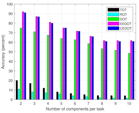 Similarly, the effect of the number of components per task on accuracy is shown in Figure 6. As the number of components per task increases, the possible number of offloading policies (which is ) increases. Therefore, the chances of selecting the offloading policy with minimum cost decreases and the performance of TOT and ROT decreases. While for the other techniques using deep learning-based approaches, the complexity between constant input and output data increases, the accuracy of CEDOT, EEDOT, and DOT decreases as the number of components per task increases. However, the performance of the proposed work is higher than all the other techniques and is almost equal to EEDOT with the advantage of low energy consumption and time delay for computational offloading and partitioning.