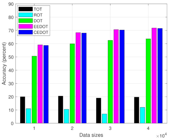Figure 7 shows the accuracy of the trained DNN along with varying size of training dataset. We can observe that the accuracy increases as the size of training dataset increases because large datasets means more data which provides more information to the DNN. The performance of CEDOT and EEDOT is better and almost equal, however, the proposed technique solves the computational offloading and partitioning jointly while EEDOT ignores the partitioning of the task.