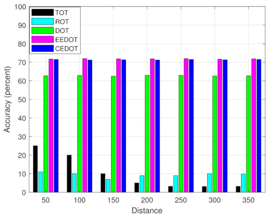 Figure 8 shows the accuracies of different techniques along with varying distance between MES and UE. CEDOT, EEDOT, and DOT have almost constant accuracy for different distances which means the accuracy of the DNN is not affected by the mobility of UEs. TOT has a decreasing behavior as the distance increases between MES and UE. It is because at lower distances the chances of offloading all components to MES are high since the transmission and reception cost is minimum. However, the accuracies of TOT and ROT are lower as compared to the other techniques because there is no learning mechanism used in TOT and ROT.