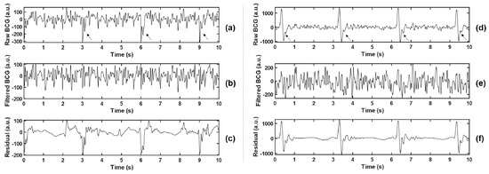 Comparison before and after adaptive filtering. (b,e) represent BCG signals after adaptive filtering in (a,d), respectively, where the arrows in (a,d) point to the pulsed artifact interference caused by the ventilator. (c,f) represent residuals between the raw BCG and the filtered BCG, namely the interference components that are filtered out.