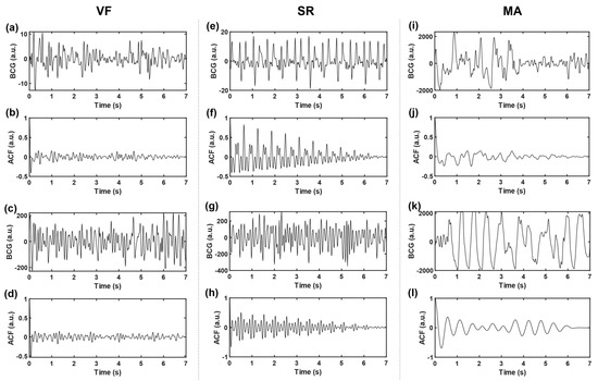 Time-domain BCG and ACF sequences. (a–d) belongs to VF, (e–h) belongs to SR, and (i–l) belongs to MA; where (b,d,f,h,j,l) represent the ACF sequences of time-domain BCG signals (a,c,e,g,i,k), respectively.