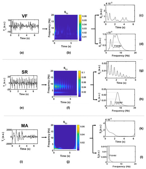 Function visualization results in the process of feature extraction. (a–d), VF; (e–h), SR; (i–l), MA, where (a,e,i) are original time-domain signals ; (b,f,j) are two-dimensional time-frequency signals ; (c,g,k) are one-dimensional signals obtained by averaging along the frequency axis; (d,h,l) are one-dimensional signals obtained by averaging along the time axis.
