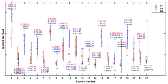 Mean and standard deviation (SD) of each of the features (in Table 2) in cases of VF, SR, and MA. The y-axis scale is normalized against the global maximum value of each specific feature (in VF, SR, and MA classes jointly).