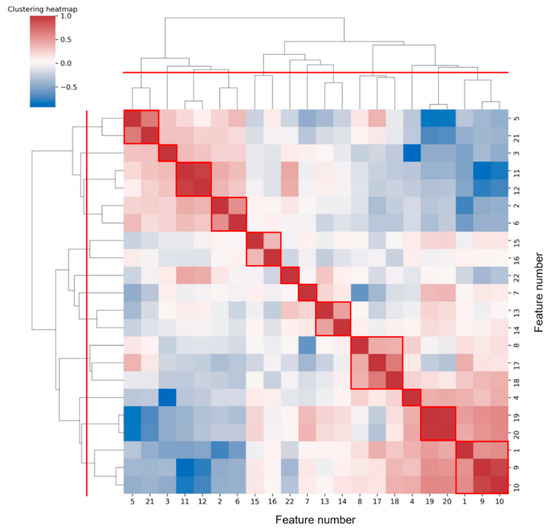 Figure 7 shows the hierarchical clustering heatmap, in which the color represents the correlation coefficient between each two features. The color changes from blue to red, and the correlation increases.