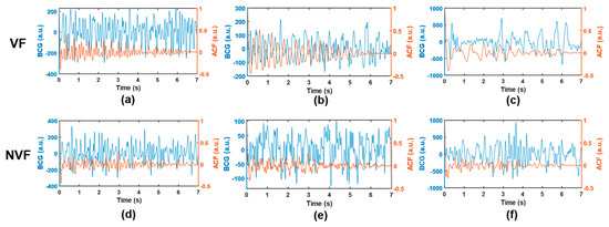 Example of misjudged signals. (a–c), VF; (d,e), SR; (f), MA. The BCG time-domain waveform and the corresponding ACF sequence are shown in blue and orange, respectively.