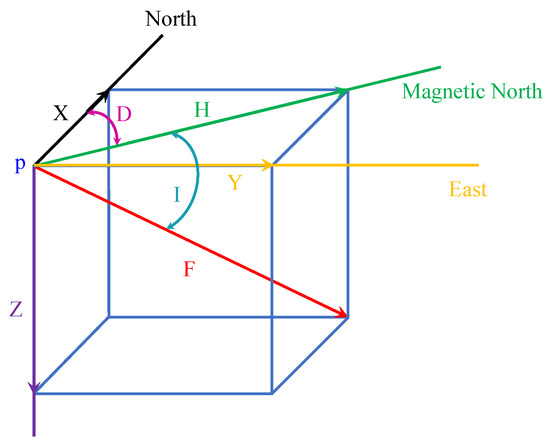 Two types of applications are found for using the magnetic field data for indoor positioning: artificially generated magnetic field and the natural magnetic field is also known as the earth’s magnetic field. This study focuses on the benchmarks used for the latter category. The earth’s magnetic field is a natural phenomenon caused by the convection currents in the outer layer of the earth. For a given point p at the earth’s surface, the magnetic field vector can be represented by x, y and z components or F, D and I where x, Y and z denotes the north, east and downward elements of the magnetic field while D and I are declination and inclination angles and F represents the total magnetic field intensity. These components are shown in Figure 1 and calculated using the following formulas
