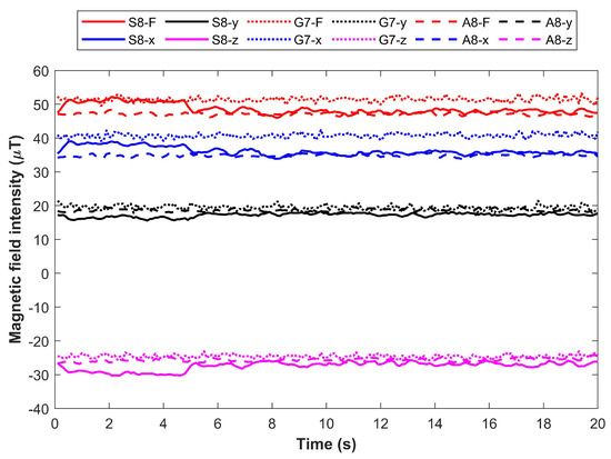 Predominantly, smartphones are used for magnetic field-based indoor positioning, and the diversity of the magnetometer used in various smartphones substantially changes the performance of the positioning approach. Several research works report the change in the magnetic field intensity when heterogeneous devices are used for data collection [15,26,27]. The difference in the measured intensity may be attributed to one or more of these factors. First, smartphone embedded magnetometers are based on microelectromechanical systems (MEMS) which are tiny but inexpensive sensors and data precision is not their primary attribute. Such sensors are famous for their small size to be used in smartphones and cost only a few dollars. Secondly, various smartphone companies like Samsung, Apple, Nokia, and Huawei, etc. use the magnetometer from various vendors and their data collection procedure, as well as, the hardware may vary. Even various brands of the same smartphone company use various magnetometer concerning their version, price, and size, etc. [27,28]. Such diversity makes it necessary to test the positioning approach from the data collected using various companies’ smartphones, as well as, various brands of the same smartphone company. For illustration, Figure 2 shows the magnetic field data collected at the same location using three different smartphones such as Samsung Galaxy S8, LG G7, and Samsung Galaxy A8. The smartphones have different embedded magnetometers which result in different measured values for the magnetic field data. Samsung Galaxy S8 has Asahi Kasei AK09916C, Samsung Galaxy A8 has Asahi Kasei AK09918C, and LG G7 has Asahi Kasei AK09915C. While the change in the measured values is comparable, the difference is visible for different smartphones.
