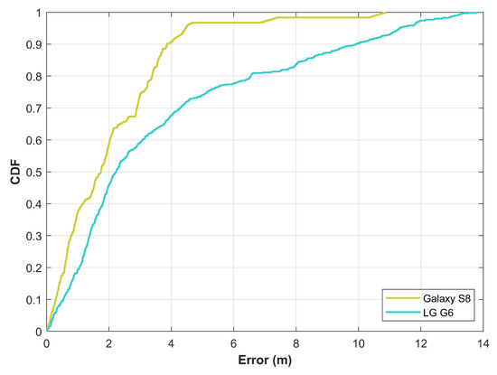The CDF graph for magnetic field data based positioning using two different smartphones.