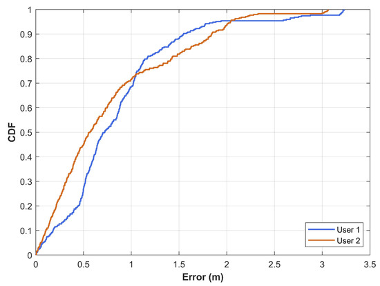 The CDF graph for positioning results involving two users with different heights. The heights of the users are 165 cm and 171 cm for user 1 and user 2, respectively.