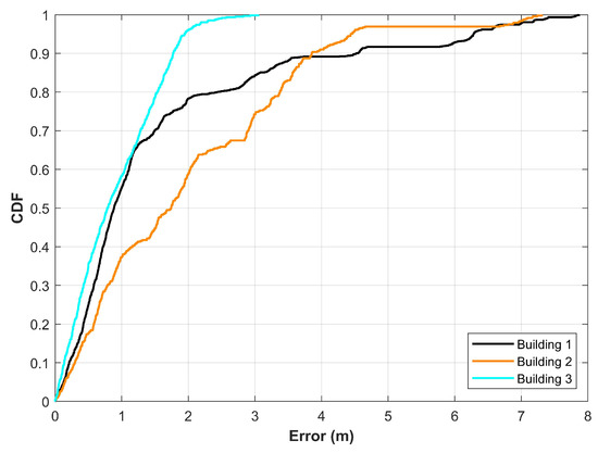 Figure 6 shows the positioning results for three buildings. It can be seen that the positioning performance is different for different buildings. It may be argued that the performance is affected due to different path geometries used during the experiments. It is a strong point and can not be ignored completely. However, during the experiments, we found that due to the indoor environment, these buildings have different distributions of the magnetic field data where building 3 has more unique fingerprints than buildings 1 and 2. Similarly, a higher number of similar fingerprints are found for different locations which are well separated for building 2. Consequently, the positioning performance for building 2 is poor than other buildings. For example, the mean error for buildings 1, and 2 is 1.5909 m, 1.9802 m, respectively, while building 3 has a mean error of 0.9047 m only. Keeping in view the results presented here, the data from multiple buildings are highly desirable to analyze the performance of the magnetic field data-based indoor positioning.