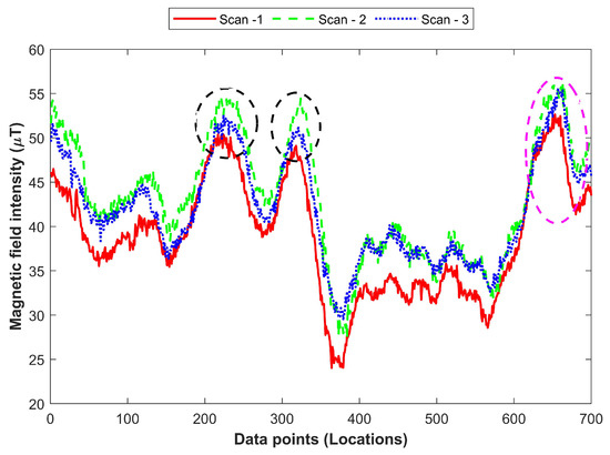 The data shown in Figure 7 have been collected over 6 to 8 months using the same smartphone, i.e., Samsung Galaxy S8. As displayed in the figure, the intensity of the magnetic field data varies over time. The change in the magnetic field data may be abrupt at certain points as indicated in black circles in Figure 7. Similarly, changes in the magnetic field data may be attributed to the varying speed of the user. For example, the magenta circled are shows the data where the change in the data is due to the walking speed of the user. Besides the influence of time, the effect of a smartphone embedded magnetometer can not be ignored completely as it tends to show slightly different data when collected over different times even using the same smartphone.