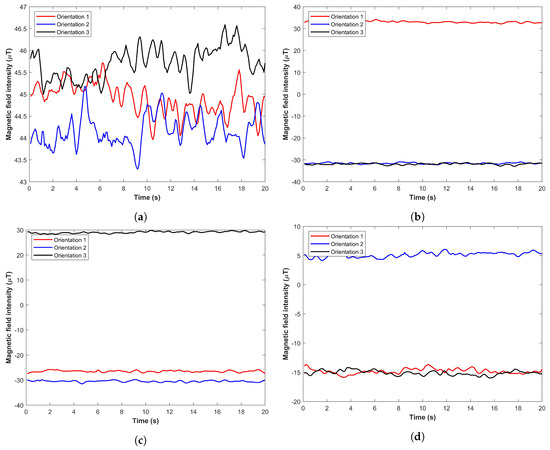 The magnetic field data for three orientations as described, (a) Magnetic F, (b) Magnetic x, (c) Magnetic y, and (d) Magnetic z.