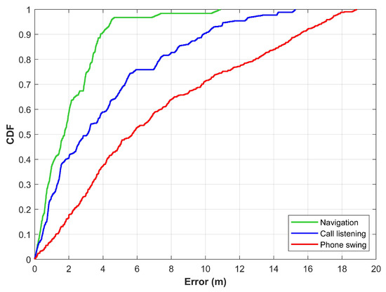 The CDF graphs for three orientations of the smartphone including ‘nvaigation’, ‘call listening’, and ‘phone swinging’.