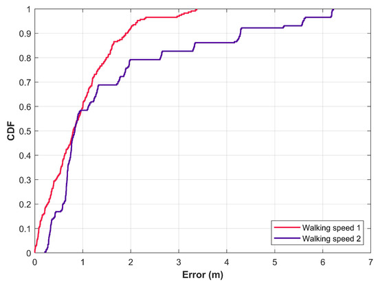 The users walking speed, as well as, the walking style varies from one user to another. So, the influence of users’ walking speed can be analyzed when the magnetic field data benchmarks provide the data for various walking speeds. Walking speed influences the positioning performance of magnetic field-based positioning approaches. To analyze this impact, two users participated in several experiments in an indoor building using Galaxy S8. The walking speed is measured using the accelerometer data of the smartphone. Positioning results are given in Figure 11 where the walking speed 1 and 2 are 0.98 m/s and 1.43 m/s, respectively. Results show that the performance of the positioning approach is affected when the walking speed is increased. During fast walking, smartphone shaking may be higher due to the hand movement leading to noise in the measured data which ultimately affects the positioning performance. At a slower speed, the user movement is consistent and data are smooth than at a fast speed. So, the data collected at different walking speeds have different positioning performances. So, for evaluating the performance of the magnetic field-based positioning approaches, the benchmark datasets should provide the data from the users walking at different speeds.