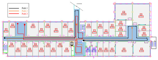 This research focuses on the data collection for Wi-Fi and magnetic field using the same location points [51]. The dataset is publicly available at http://archive.ics.uci.edu/ml/datasets/UJIIndoorLoc-Mag and accessed on 3 May 2021. The data are recorded using a smartphone, as well as, the smartwatch taken at the same time from a human surveyor. The smartphone used for the data collection is Sony Xperia M2 while LG W110G Watch R is used as the smartwatch. The dataset is collected over a single place which contains offices, corridors, and connected corridors through turns. Besides the magnetic field data, the IMU data are collected including accelerometers and orientation sensors. Figure 14 shows the path trajectory that is used for the data collection.