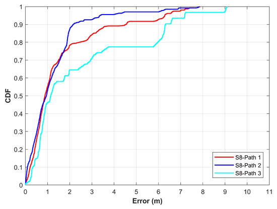 The CDF graphs for various path geometries used to evaluate the performance of magnetic field-based indoor positioning [14].