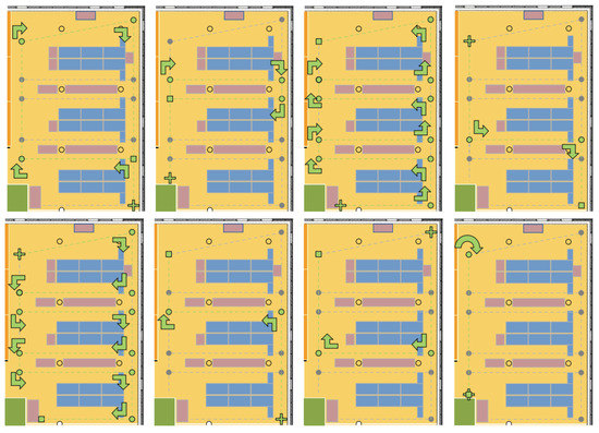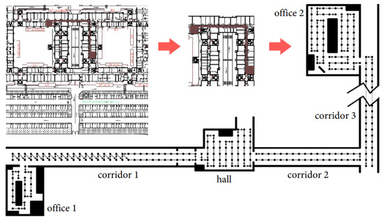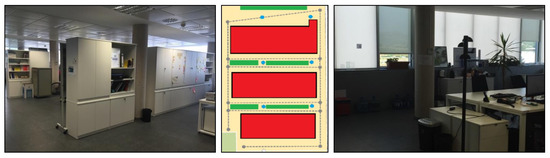 UJIIndoorLoc-Mag is the magnetic field data which was presented at IPIN 2015 by [54]. The dataset is publicly available at https://archive.ics.uci.edu/ml/datasets/UJIIndoorLoc-Mag and accessed on 3 May 2021. The dataset is collected in a laboratory environment as shown in Figure 18 and the data are collected as continuous samples. The laboratory consists of 8 corridors and 260 m space, separated by bookcases and desktop computers. Space is divided into several smaller units for the data collection with a starting and ending spot and the data are collected when the user walks between these points at each 0.1 s. The data also stores the starting and ending position for each path, as well as, the coordinates of path turns in case of corridor intersections. The data are collected separately for training and testing where the test paths are claimed to be complex involving multiple turns in the intersections. Moreover, two different smartphones are used for test data like Google Nexus 4 and LG G3 both running on Android 5.0.
