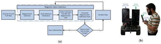 MagPIE is a magnetic field dataset introduced in an international conference on indoor positioning and indoor navigation (IPIN) in 2017 [38]. The dataset is publicly available at http://bretl.csl.illinois.edu/magpie and accessed on 3 May 2021. It records magnetic anomalies in the indoor environment using the smartphone IMU sensors. The data are collected in multiple buildings having different dimensions and indoor infrastructure. Data collection is performed using two platforms: handheld smartphones and wheeled robot-mounted smartphones. Motorola Moto Z Play and Lenovo Phab 2 Pro are used for data collection. Ground truth measurements are calculated using Google’s Tange API on Lenovo smartphone. Figure 15 shows the pipeline and data collection platform used for MagPIE.