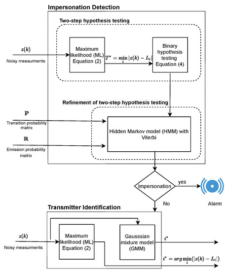 Figure 3 shows a flow graph of the proposed methodology. The noisy estimated measurement/path loss at slot k was fed to a two-step mechanism for impersonation detection, and the HMM was used to refine the outcomes of the two-step mechanism with the help of transition and emission probability matrices (i.e., and ) and the Viterbi algorithm. Transmitter identification was done via the ML and GMM approaches when no impersonation was decided.