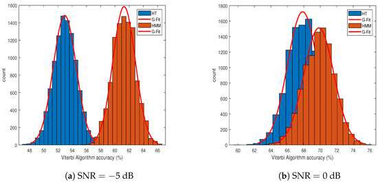 Performance comparison of two-step hypothesis testing and the hidden Markov model (HMM) with Viterbi algorithm. (a) Histogram comparison for a highly degraded channel, i.e., SNR = dB. (b) Histogram comparison for a moderately degraded channel, i.e., SNR = 0 dB. Performances of both approaches get closer and closer when SNR increases.