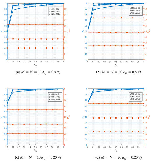 Figure 4 represents the two probabilities against SNR where the improvement in error probabilities with an increasing SNR can be seen clearly. The designed parameter decreased , but increased .
