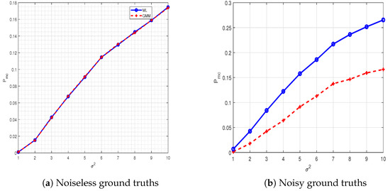 Misclassification error against estimation error for two-step hypothesis testing and GMM. (a) A scenario is considered where the perfect ground truth vector, i.e., is obtained via a secure channel. (b) A scenario is considered where acquired ground truths are noisy. GMM has an advantage over ML when ground truths are noisy.