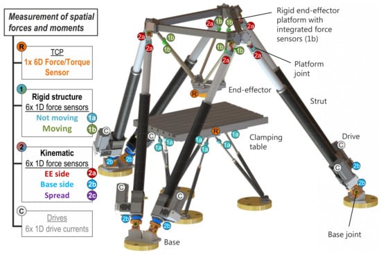 - Friedrich, C.; Kauschinger, B.; Ihlenfeldt, S. Spatial force measurement using a rigid hexapod-based end-effector with structure-integrated force sensors in a hexapod machine tool. Measurement 2019, 145C, 350–360. [Google Scholar] [CrossRef]