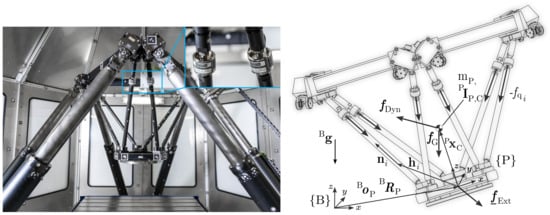 Machine-integrated force measurement solutions have been studied since the beginning of force measurement and are outlined in a detailed state-of-the-art overview in [1]. In short, individual strain-gauge based solutions with a specific design, such as spindles [4], end-effectors [5], or even the workpiece [6], are cost-intensive and do not, thus far, provide a spatial measurement in 6 DoF. Integrated torque sensors in joints [7] still require large mechanical and modelling efforts (friction, stick-slip) and are not advantageous for the desired application in parallel structures and kinematics, where mainly longitudinal forces appear. Concerning the use of rigid Stewart or hexapod structures as force sensors, the most promising works with practical results are a multicomponent calibration system [8,9], a sensor for heavy duty applications [10,11,12], miniaturised sensors, for example, for surgery [13,14], and a measuring system for industrial applications [15]. Still, all of these sensors have been designed as pure (machine independent) measuring devices with static calibration. Neither a movement of the hexapod struts nor of the complete sensor as part of a machine is intended. Consequently, no kinematic or dynamic influences need to be respected within a measurement model.
