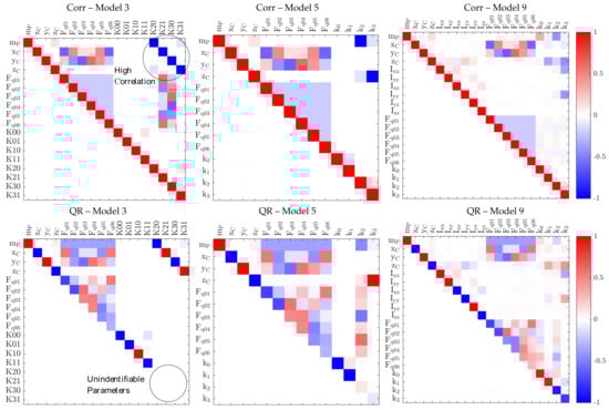 Matrix of Pearson correlation coefficients (Corr) and upper -part of QR decomposition of (QR); left: model 3 (not identifable in any description based on ), centre: preferred quasi-static model 5 (includes models 0, 2), right: preferred dynamic model 9 (includes models 6, 7). The models 1, 4, 8 are not displayed due to too many parameters. Corr shows the pairwise linear correlation between 2 parameters, that points out linear dependencies. In high values in the row behind the diagonal element indicate dependent parameters. The diagonal elements of that are less than the numerical zero indicate unidentifiable parameters [24].