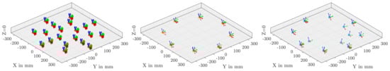 Table 5 shows results for a reduction to 30 poses starting from a working dataset of 480 generated poses that include position changes from −300 mm to 300 mm in steps of 100 mm in XY and, at each position, orientation changes from 10 ° to 20 °, 0 ° to 270 ° and −15 ° to 15 ° in steps of 10 °, 90 ° and 15 °, respectively, for modified Euler angles [29], Figure 4 left.