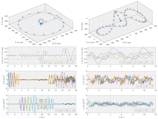 Table 6 compares identification results for both dynamic trajectories. Both identify similar rigid body parameters and sensor offsets, where the manually chosen trajectory shows smaller uncertainties in both, and , when compared to the periodic trajectory. Further data processing, such as the selection of highly accelerated motion sections or the filtering of the accelerations based on discrete Fourier transformation (DFT-filtering), does not improve the results for the presented application. As a consequence of less measuring noise in accelerations and smaller uncertainties during identification, the manually chosen trajectory is preferred.