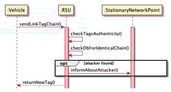 Thanks to the use of a link tag system, the network can easily detect the vehicles whose presence is fake. Since this attack is carried out by a physical device (vehicle) transmitting signals on behalf of other nonexistent vehicles, each fake device will also have a tag link chain to be able to confirm its identity for network communication purposes. Since having identical chains describing the vehicle’s trajectory by two real vehicles is relatively small, it can be assumed that having chains with identical tags means that they are bogus vehicles, even if each device reveals its presence with a random delay. The course of communication between the vehicle and the RSU in order to certify its authenticity and receive the next tag could be seen as in the diagrams in Algorithm 5 and in