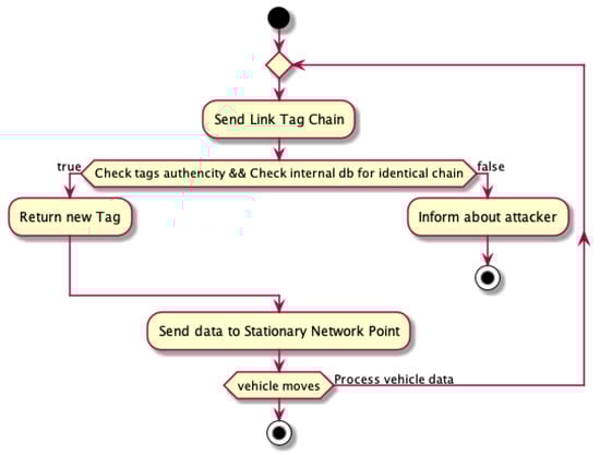 Each roadside unit (RSU) is responsible for sending vehicles within the range of the so-called tag link that contains information about RSU, vehicle position, and timestamp. It should be mentioned that the new timestamp must represent a certain period of time, selected taking into account the location of the RSU (e.g., 500 ms). To protect the network against the possibility of counterfeiting tags, it should be possible to verify its authenticity, e.g., by attaching a digital signature. In this way, the vehicle has a tag link string that describes the history of its movements.
