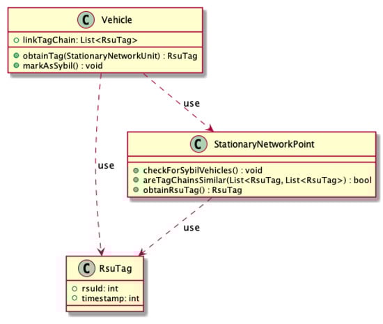 Figure 8) is responsible for generating tags for checking in passing vehicles. It also verifies whether the vehicles within the range have different chains. If they are identical, it marks all these vehicles as attackers—it is done by setting a flag on the program’s vehicle object. In fact, such information should be propagated through the entire network. Events reported by vehicles marked as attackers are ignored.