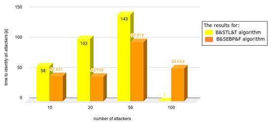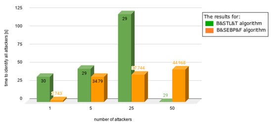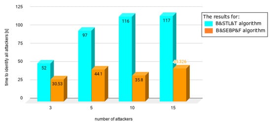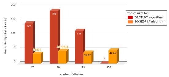 Figure 12, the same number of users was involved—100. The number of attackers varied from 20 up to 100. The time needed to identify the first attacker decreased significantly up to 78%.