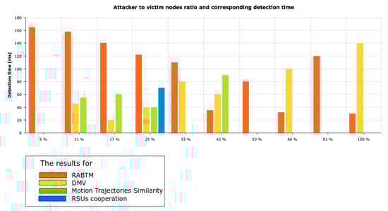 Figure 15). The results obtained by other authors varied from 30 up to 140 ms in case of high network load. However, some of the authors obtained significantly worse results, even with the small attacker–victim ratio. The average ratio between normal drivers and attackers varied from 5% up to 100%; the average ratio oscillated about 30%.