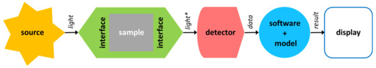 Figure 1). The diagram equally describes the information flow of any spectroscopic technique; it is used here for the convenience of further discussion of OMS development approaches. The flow describes the source light transformation by the sample, its conversion to data at the detector, and then the modeling result using the software.