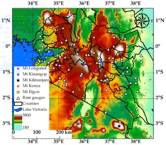 The area investigated (southwest Kenya) is shown in Figure 1 using Advanced Land Observing Satellite (ALOS) World 3D 30 m (AW3D30) digital elevation model (DEM) []. The main rainy season occurs from March to June (“long rains”), and the second season is from October to December (“short rains”). The rainfall variability in the area is generally linked to the seasonal passage of the intertropical convergence zone (ITCZ) over Kenya [], tropical pacific sea surface temperature [], El-Niño Southern Oscillation (ENSO) and the Indian Ocean Dipole (IOD) [,]. Nonetheless, relief features like mountains (Mount Kenya, Rift valley) and large inland water (Lake Victoria) bodies influence the local rainfall variability [].